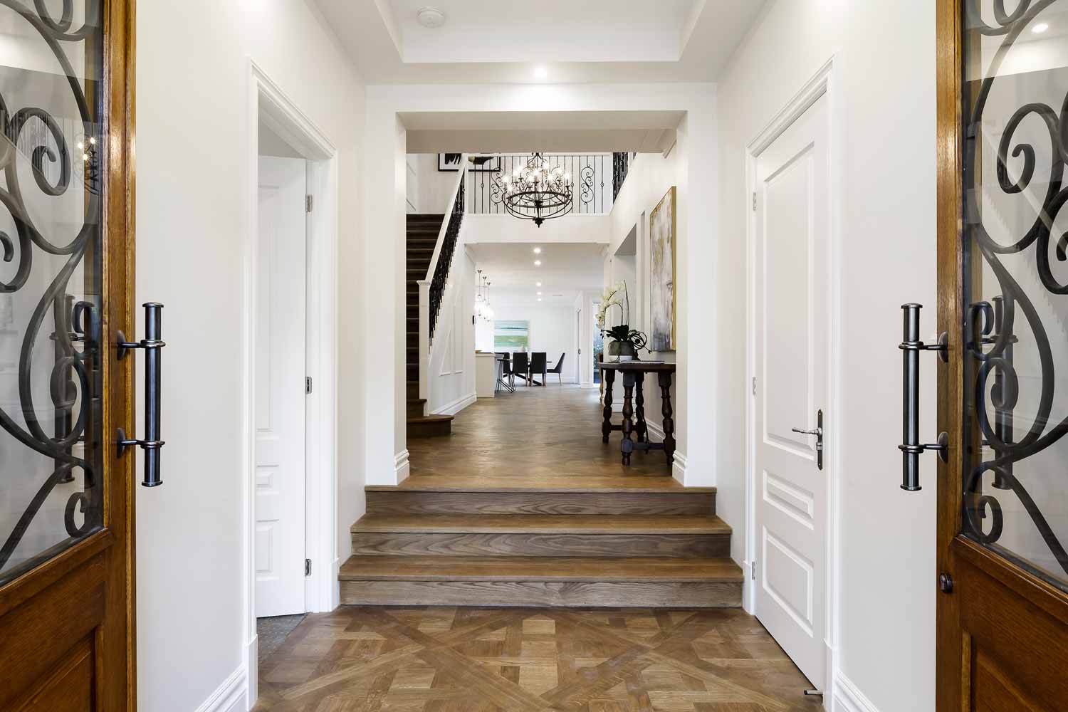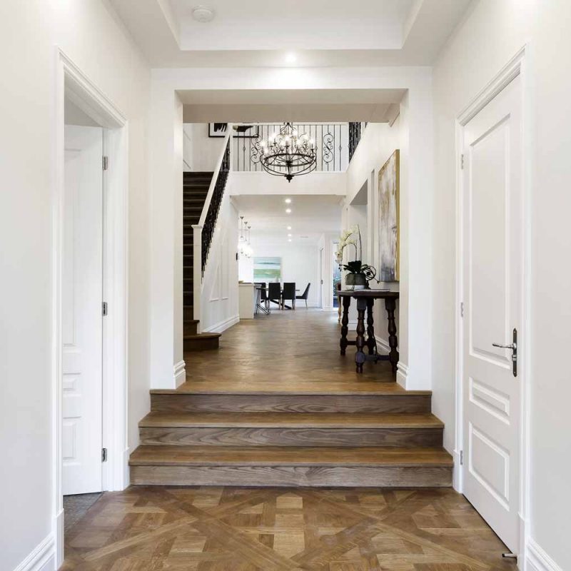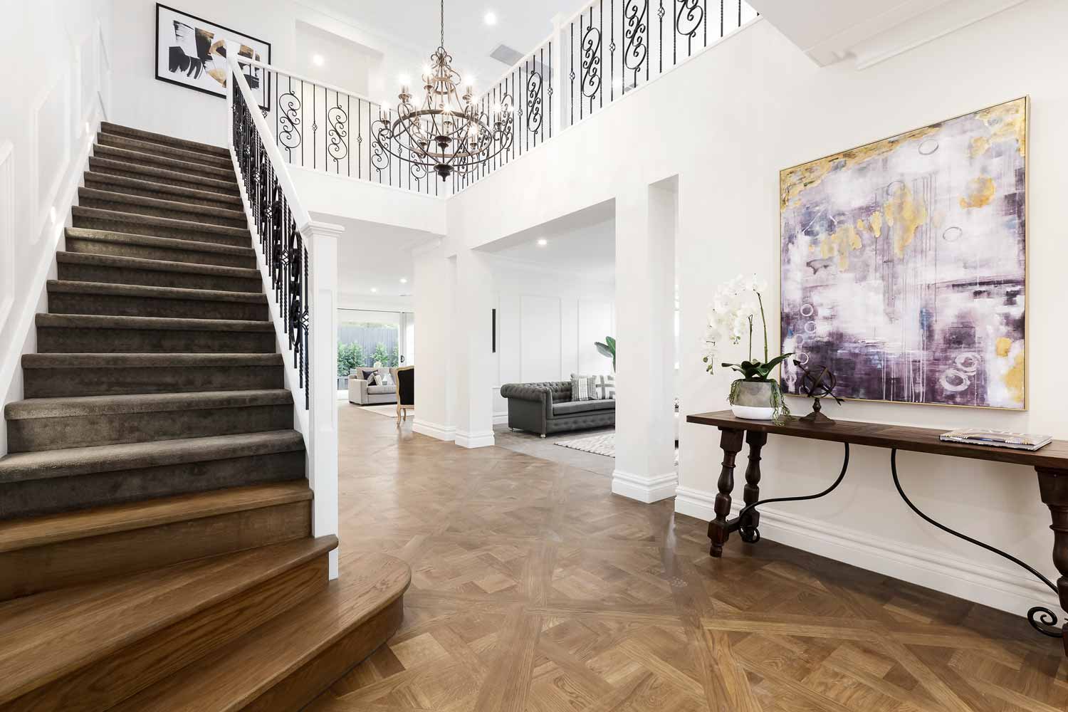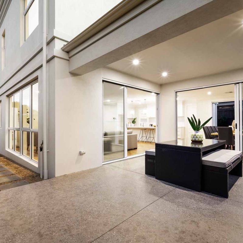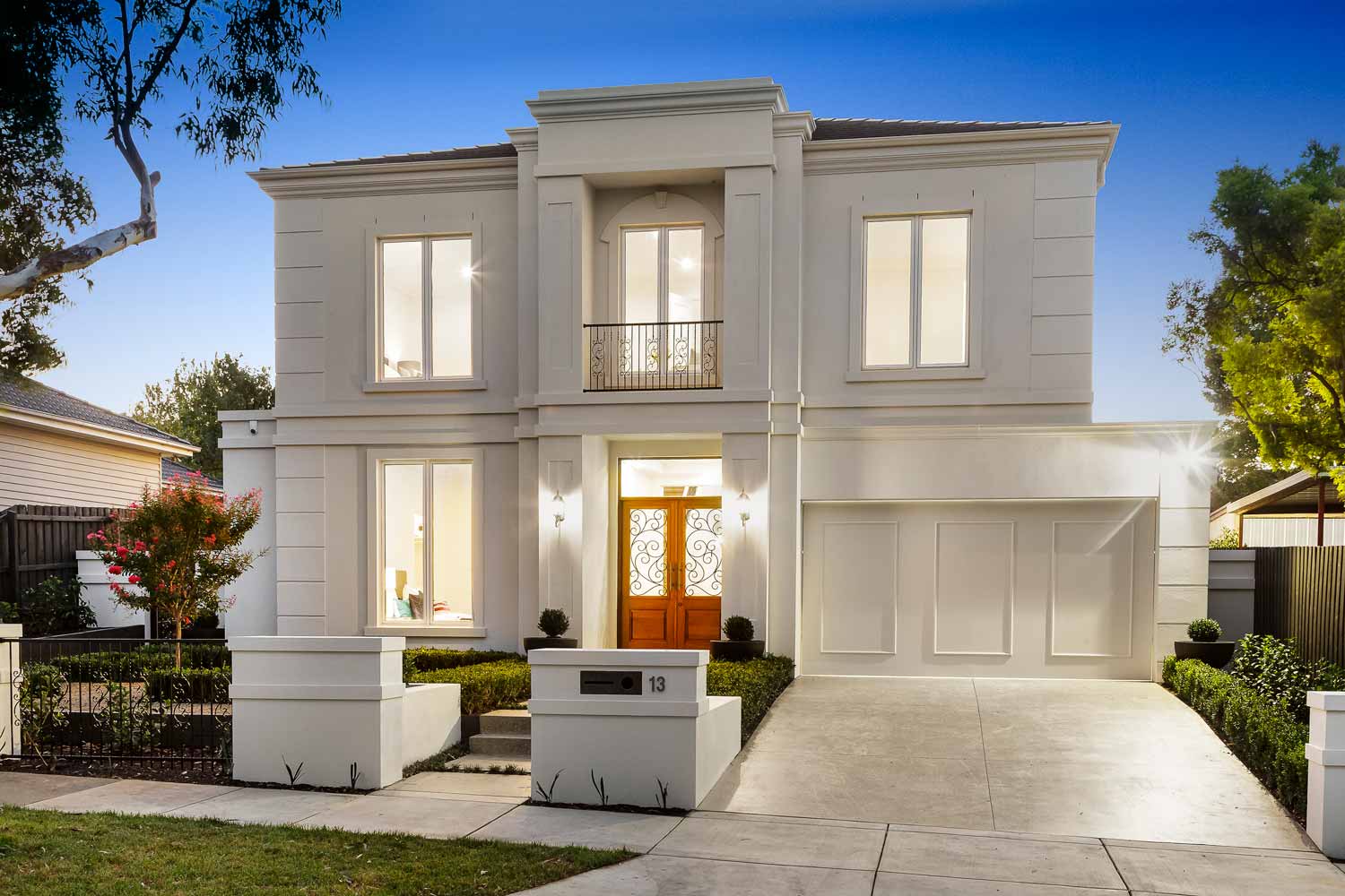 A beuatiful french farm house double storey custom home with polished concrete driveway, feature rendered moulds making up the fascade.