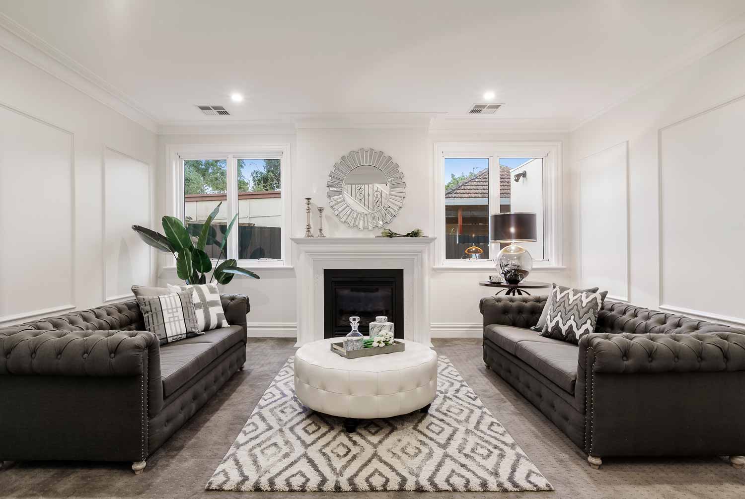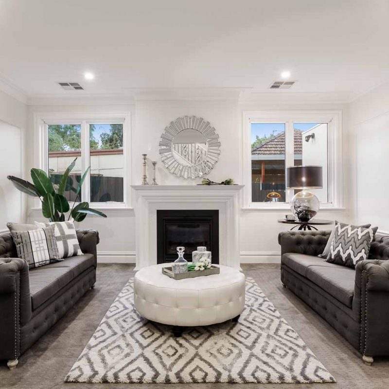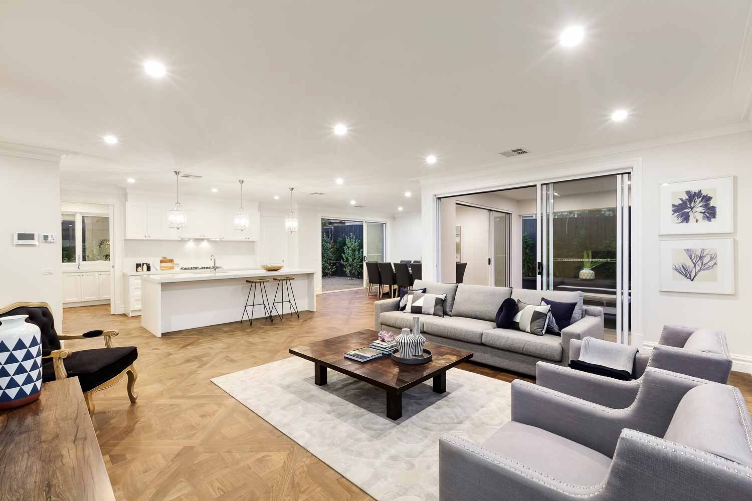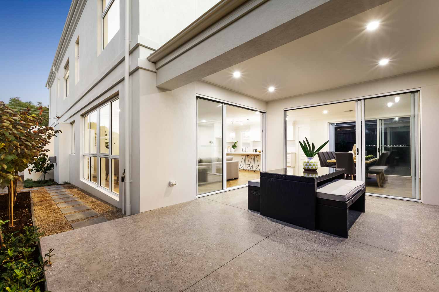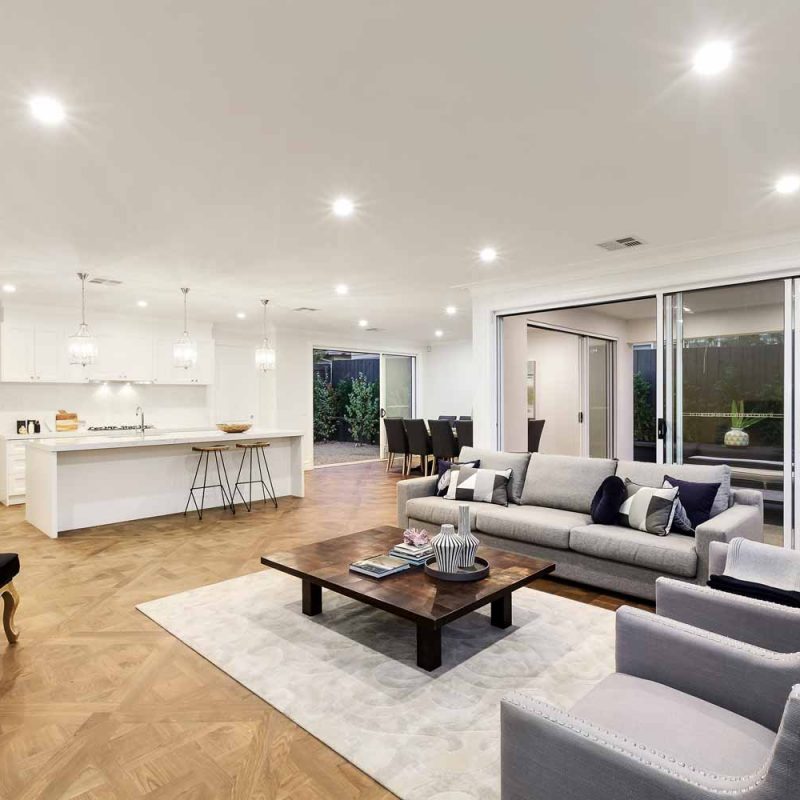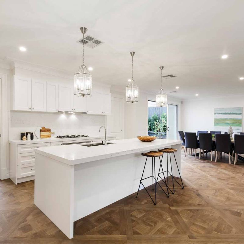 A beuatiful french farm house double storey custom home with polished concrete driveway, feature rendered moulds making up the fascade.